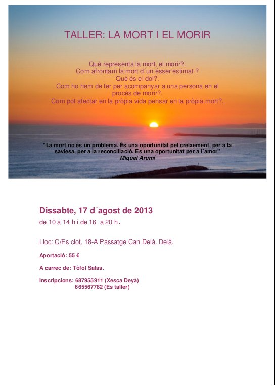 La mort forma part de la vida, de l'existència, son dues cares de la mateixa moneda, i sobretot es un fet. Així i tot continua essent un tema "tabú", un tema que mos costa afrontar, no en volem xerrar,o no sabem com fer-ho. Es viu com un trauma, i més si es mor un ésser estimat en que moltes persones quedam marcades de per vida i pot ser de manera diferent.